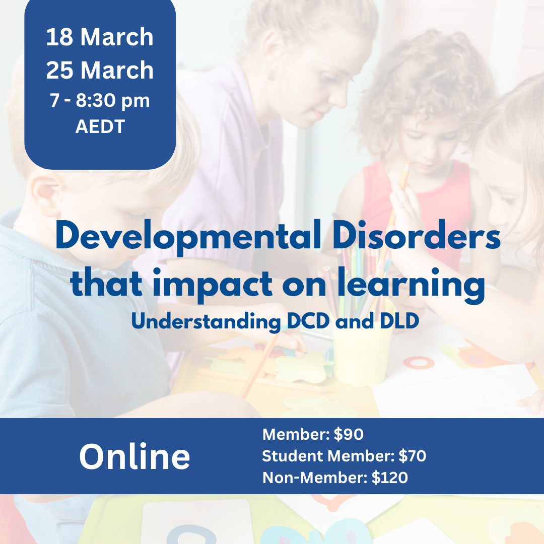 This practical two-part course (18/3, 25/3) will focus on Developmental Coordination Disorder and Developmental Language Disorder and will be delivered by an experienced Occupational Therapist and Speech Pathologist. See below for the program.